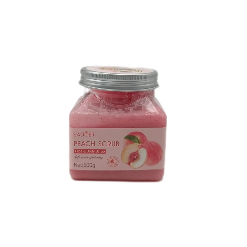 اسکراب صورت و بدن رایحه هلو برند سادور | SADOER یک لایهبردار است و حاوی دانههای شنی فعال است که منجربه لایهبرداری ملایم پوست میشود.
