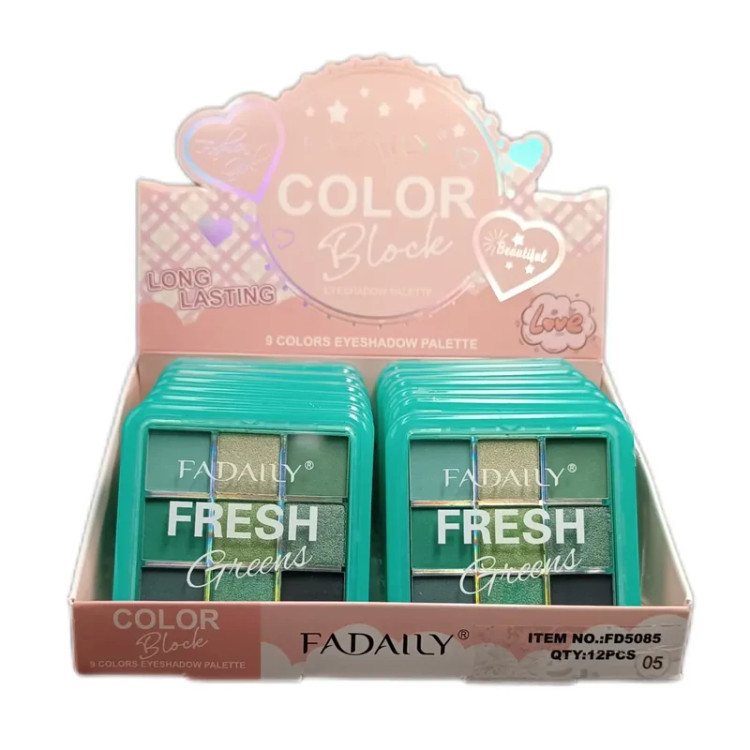 پالت سایه رنگ سبز برند فادالی | FADAILY دارای 9 رنگ و اکلیل بالاست، رنگ های روشن تا رنگ های تیره و دودی و انواع رنگ بندی ها را شامل می شود.